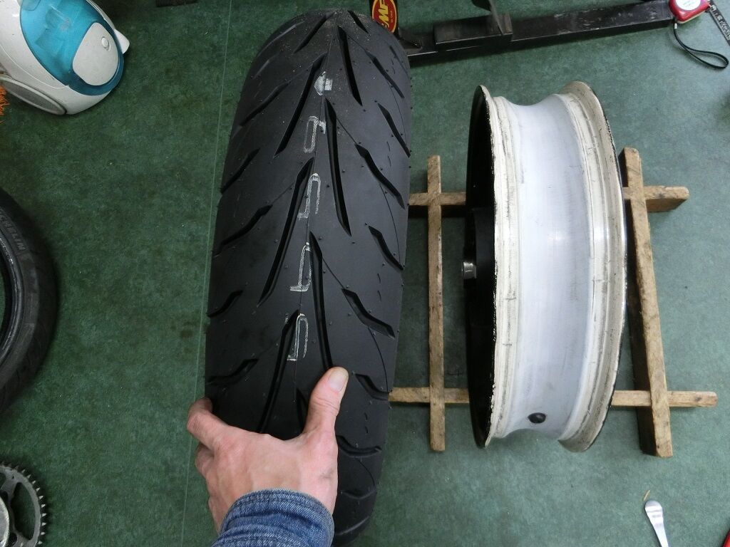 やっと外して新品タイヤを組み付けます。